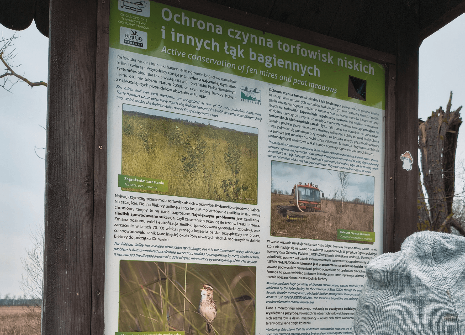 Головною технічною метою візиту стало знаходження ефективних рішень для масштабного відновлення проєктної ділянки в Україні - торфовища Бірки на Волині, території національного природного парку «Прип’ять-Стохід». Це значна площа 1700 га, яка потерпає від заростання чагарниками та очеретом, що критично погіршує умови для гніздування очеретянки прудкої. Під час виїзду на відновлені території Бєбжанського національного парку наші фахівці безпосередньо побачили ділянки торфовищ після планомірних розчисток, детально вивчали роботу спеціалізованої техніки — ратраків та тракторів на надшироких гусеницях. Саме таке обладнання здатне працювати на осокових торфовищах з купинами, забезпечуючи низький тиск на ґрунт і не пошкоджуючи його структуру. Порівняльні розрахунки показали вражаючу різницю: механізований ратрак здатний мульчувати чагарники на 2-3 гектарах за день, що у вісім разів швидше за ручну працю. Для Бірок це означає реальну можливість підготувати площі для гніздування протягом коротшого періоду. Окрім техніки, наші колеги з Польського товариства охорони птахів (OTOP-Ogólnopolskie Towarzystwo Ochrony Ptaków) поділилися досвідом переробки біомаси та сталого управління болотами задля підтримання територій у належному стані.
